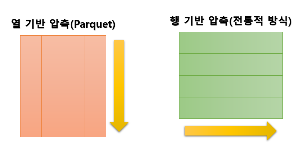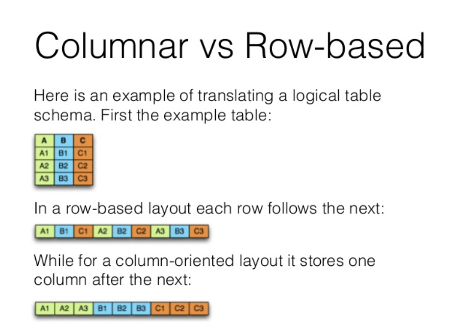열(Column)기반 압축을 하고있는데 이는 칼럼의 데이터가 연속된 구조로 저장되어 있다. Row 중심으로 저장되어있는 것과는 아래 사진을 보면 이해가 빠를 것 같습니다.