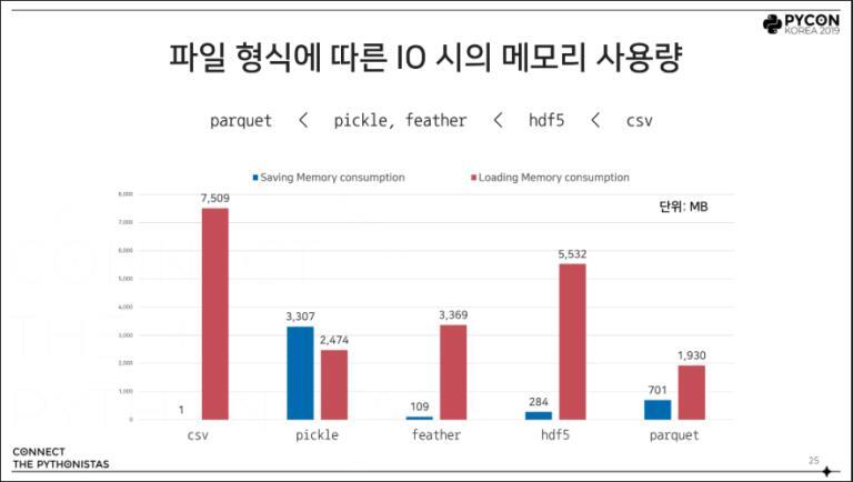 위는 파일 형식에 따른 IO시 메모리 사용량과 파일의 크기를 비교한 파이콘 발표 자료인데요, 비록 판다스를 기준으로 측정된 지표이긴 하나 파일을 저장할 때 CSV보다는 parquet, hdf5 등의 형식을 사용하면 시간과 메모리를 절약할 수 있습니다.